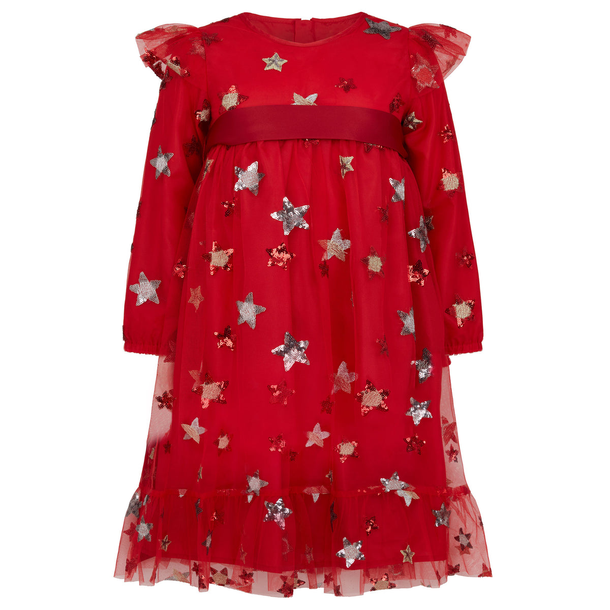 Seren Embroidered Sequin Star Girls Party Dress, Red